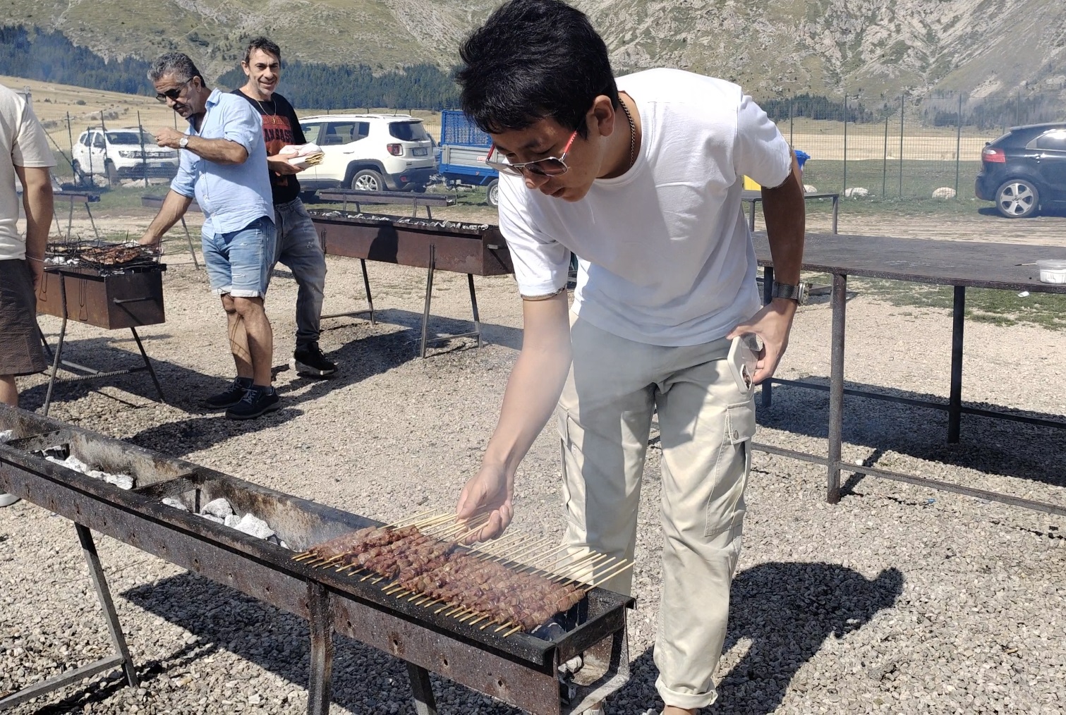 Da lì il percorso lo ha condotto verso l’altopiano di Campo Imperatore, conosciuto anche come il “piccolo Tibet”, dove svetta la cima più alta degli Appennini: il Gran Sasso. Qui ha potuto non solo assaggiare, ma anche cucinare all’aperto i celebri arrosticini, simbolo della cucina popolare abruzzese.