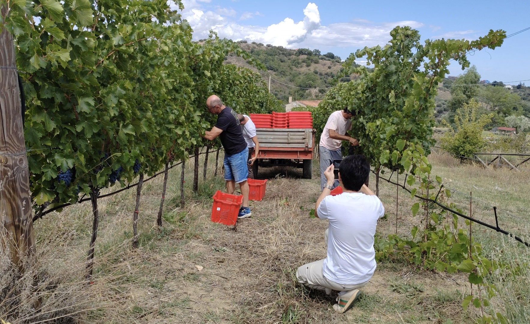 Il viaggio è iniziato tra i filari di un tipico vigneto di Montepulciano d’Abruzzo, nel pieno della raccolta manuale. Qui Simone ha potuto vivere in prima persona l’autenticità della vendemmia: assaggiare un acino appena colto, staccare un grappolo e immergersi nei profumi della campagna abruzzese.